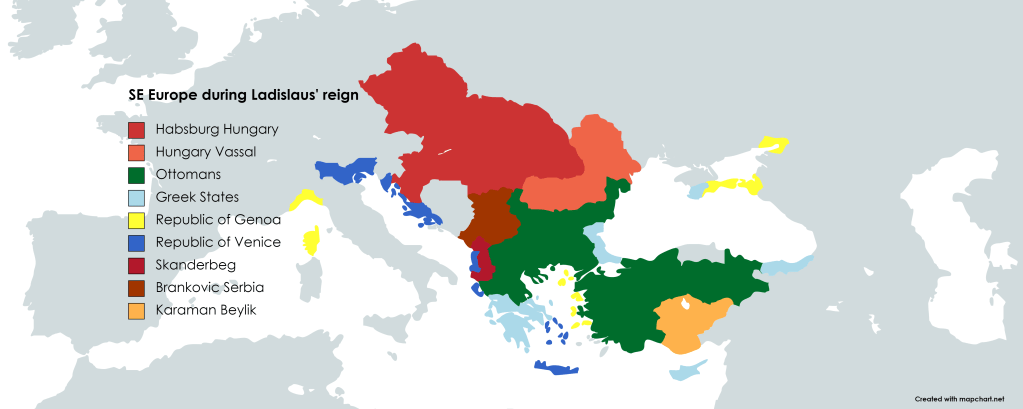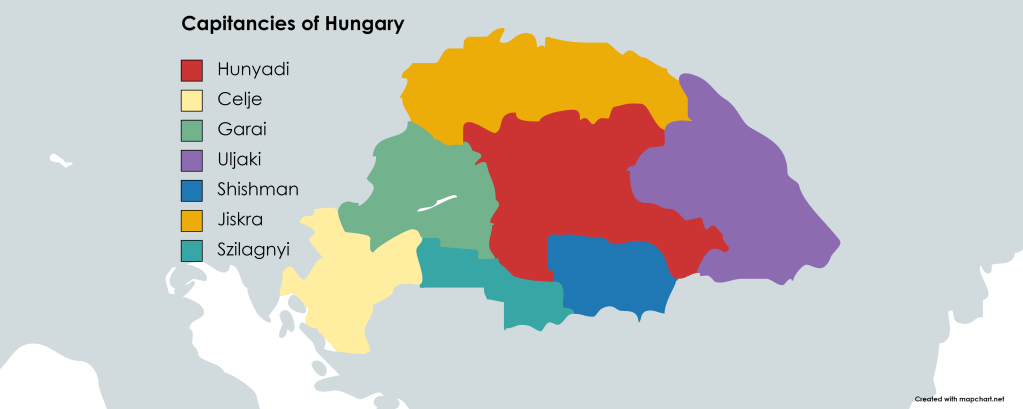 For Hungary, the estates (counts and bans) elected 7 different captains-generals to foster peace within the kingdom while the new king was yet to be chosen. Among the 7 were Miklos Uljaki in Transylvania, Fruzhin Shishman in Temes, Janos Hunyadi in , Ulrich Celje in Croatia, Jan Jiskra in Nitra (north), Lazslo Garai in the Transdanube (east), and Mihaly Szilagnyi in the south. These 7 were just supposed to be generals of their armies in these zones but military power in a monarchy also means political power. The estates elected Ladislaus Habsburg to be the king but not everyone agreed with how to acquire the toddler. Also Ulrich downplayed the necessity for Hunyadi to be in this position because of his failure in Varna with killing the last king. “At least he fought the Turks” and “Wladyslaw isn’t even confirmed dead” were counter arguments against the envious man. Coming from the city of Cilli, Ulrich was also least concerned about the Ottoman threat while Hunyadi practically lived on the border. Eventually though, they agreed it should fall upon the White Knight to rescue Ladislaus.