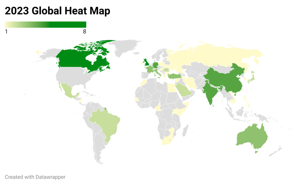 You are reaching the end. Here are heat maps of locations mentioned in this chronicle. For the American one, the bluer, the more action. Lots of no action in the midwest this year. I did mentioned Cascadia (Washington and Oregon) and Appalachia (Tenn, Ken, Virginias, Carolinas) as regions so those states get bonus points. . You may have noticed that I tried to mention ethnicities and places of origin whenever introducing someone, so that is included in these maps. That means a singular person would put their entire nation on the map, even when they were still American citizens simply with foreign ancestry. As seen in the global map, predictably, the Anglo or higher populated nations are the most green. The USA’s combined 53 entries were ignored in the latter map so single mentions like Poland could be distinguishable from Turkey (4) and then Canada (the peak of 8). But hey, every continent is represented. In sub-Saharan Africa, one can see Mr Beast’s footprints.