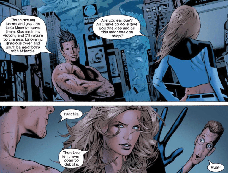 Denouement: Ben Grimm goes to the Masters house to apologize to Philip and beg for Alicia’s hand in marriage while Johnny and Crystal unite and kiss over the Midtown skyline. Reed spends the day taking care of his wife much to the excitement of Agatha. In Wakanda, T’Challa indeed convinces the council to open borders. Namor, disguised in a coat, hides as he walks the streets of Europe.
